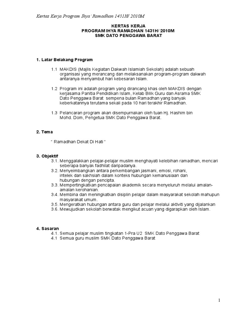 Contoh 2 kertas kerja ihya ramadhan. 22 Meningkatkan keyakinan diri serta menguji ketahanan fizikal dan mental setiap peserta sepanjang bulan Ramadhan 23. KERTAS KERJA IHYA RAMADHANdoc - PROGRAM IHYA RAMADHAN 2016M 1437H 1.